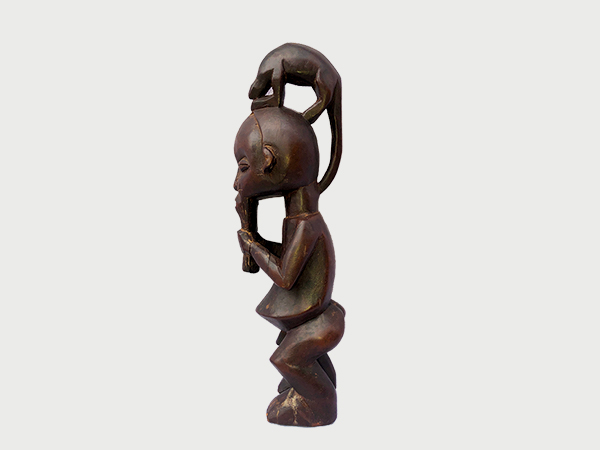 Statuette en bois représentant un grand chasseur des Holo, figuré avec un caméléon posé sur sa tête et la main tirant sa barbe. La sculpture combine réalisme et symbolisme, illustrant la force, l’habileté et le lien avec la nature dans l’art traditionnel Bandundu.
