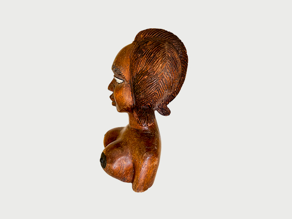Buste sculpté représentant une femme africaine à la coiffure finement tressée. Les traits délicats et l’élégance de la posture mettent en valeur la beauté féminine africaine ainsi que le raffinement de l’art sculptural traditionnel.
