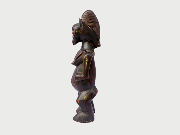 Statuette anthropo-zoomorphe en bois représentant une figure féminine dont la tête adopte la forme d’une chouette. La sculpture allie traits humains et animaux, illustrant l’art symbolique Suku et la subtilité des représentations rituelles.