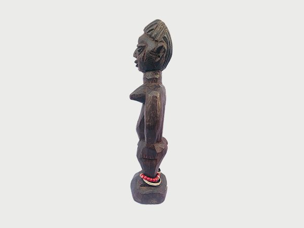 Statuette en bois représentant une jumelle chez les Yoruba. La sculpture illustre les traits et la posture du personnage, soulignant l’importance culturelle et symbolique des jumelles dans la tradition Yoruba.