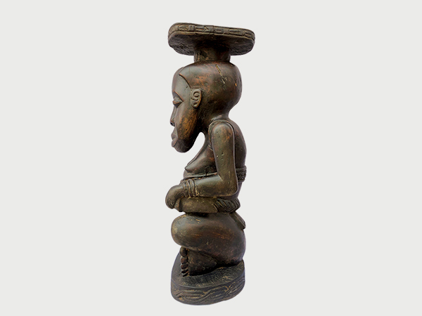 Statuette en bois représentant le roi Mu-kuba, figure centrale du pouvoir politique et spirituel. La sculpture met en valeur la posture royale, les attributs de commandement et l’élégance symbolique propres à l’art Kuba.